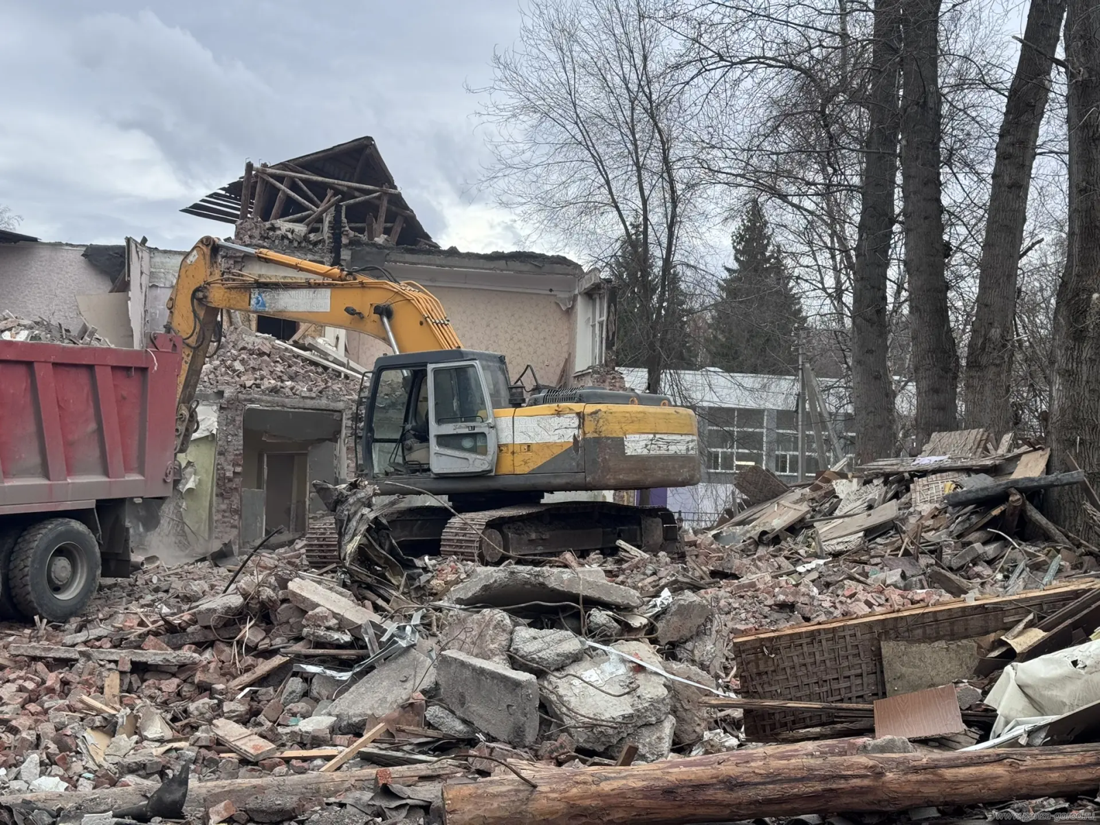 В городской администрации пояснили, что разбор конструкции ведётся поэтапно: подрядчик уже снимает кровлю, демонтирует стены и очищает территорию от строительных остатков.